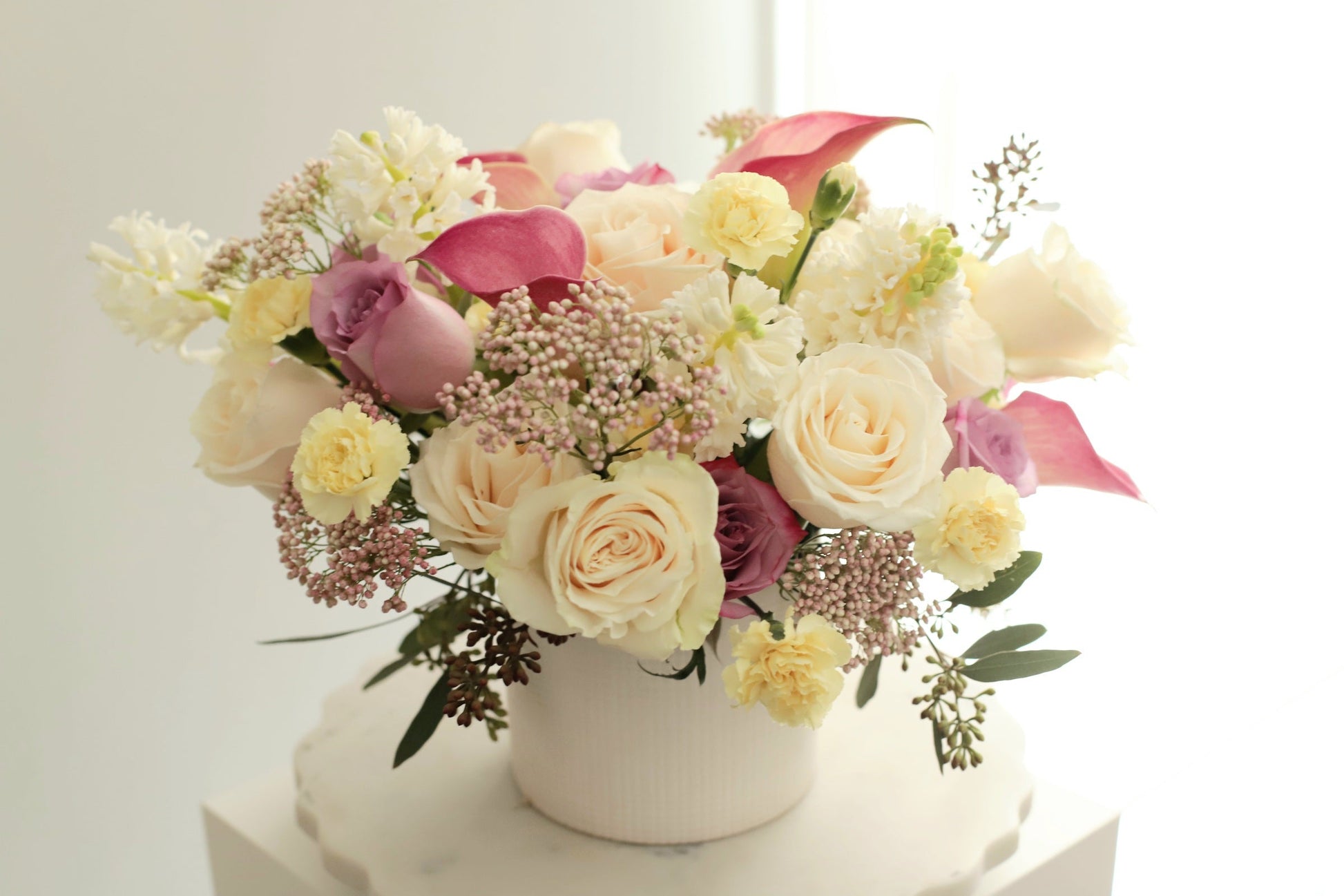 Experience the allure of bespoke elegance with our Designer's Choice Flower Arrangement. Radiant pastel hues, including enchanting main colors such as pink, red, yellow, orange, purple, and white, come together in a sophisticated display, meticulously handcrafted by our skilled designers. The only decision you make is choosing the main color, and we'll adorn your arrangement with complementary pastel flowers. Set in a simple container, each arrangement is a unique masterpiece, perfect for expressing your love. Enjoy local delivery in Chicago and Chicagoland. Elevate your celebration with the timeless beauty of our exclusive Designer's Choice. Order now for an unforgettable Valentine's Day.